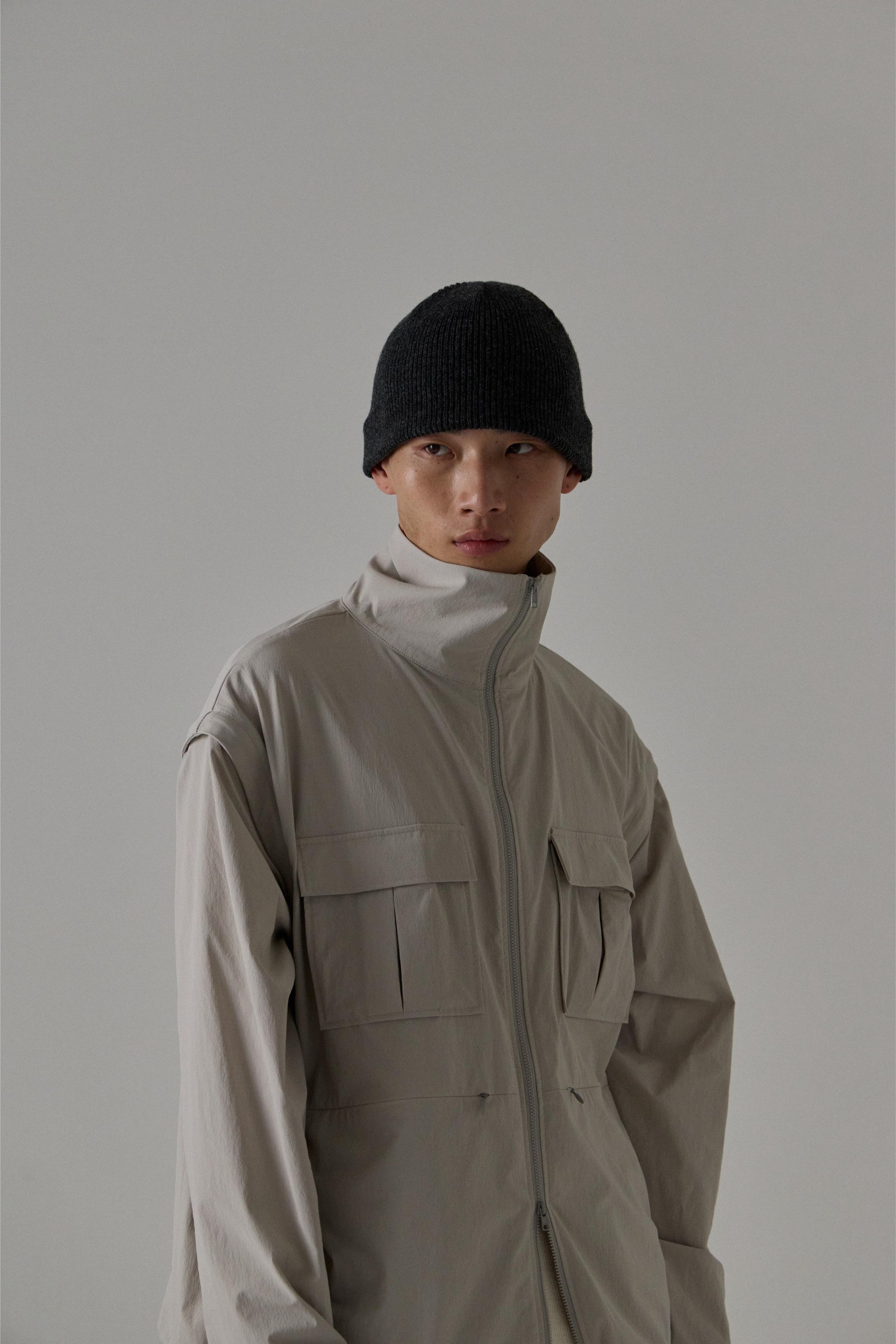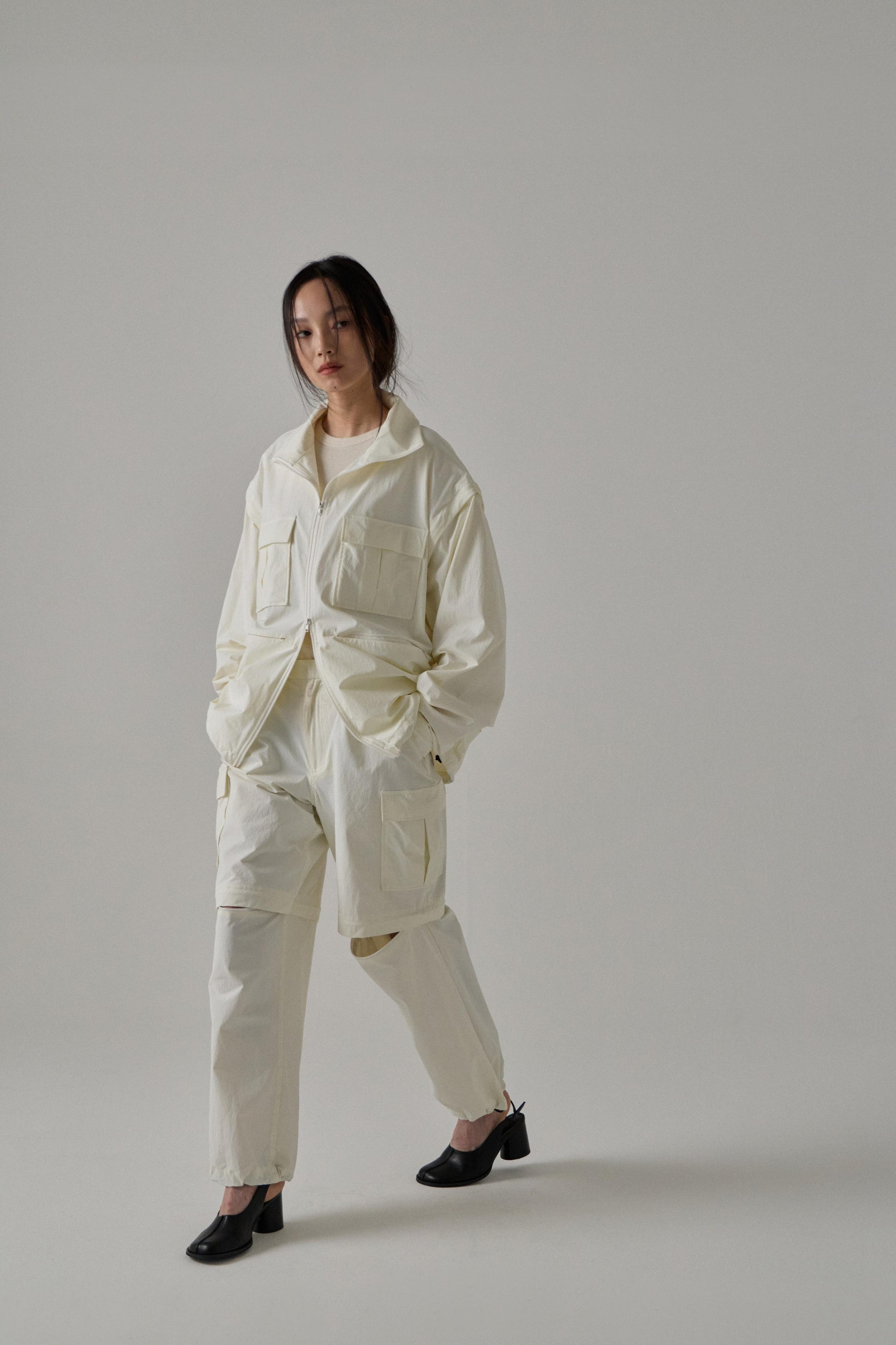 タテヨコにポリウレタン糸を使用し伸縮性に優れた素材。コシがあり、ナイロン特有のさらっとした肌触りが特徴。撥水、紫外線ブロック、接触冷感、速乾、ウォッシャブルと機能性も備わる素材のため、アウトドアシーンにも活躍します。袖を取り外すとベストとして使用できる2way仕様、袖と裾はアジャスターで調整可能。NYLON CARGO PANTS / NYLON PARACHUTE PANTSとセットアップで着用できます。
